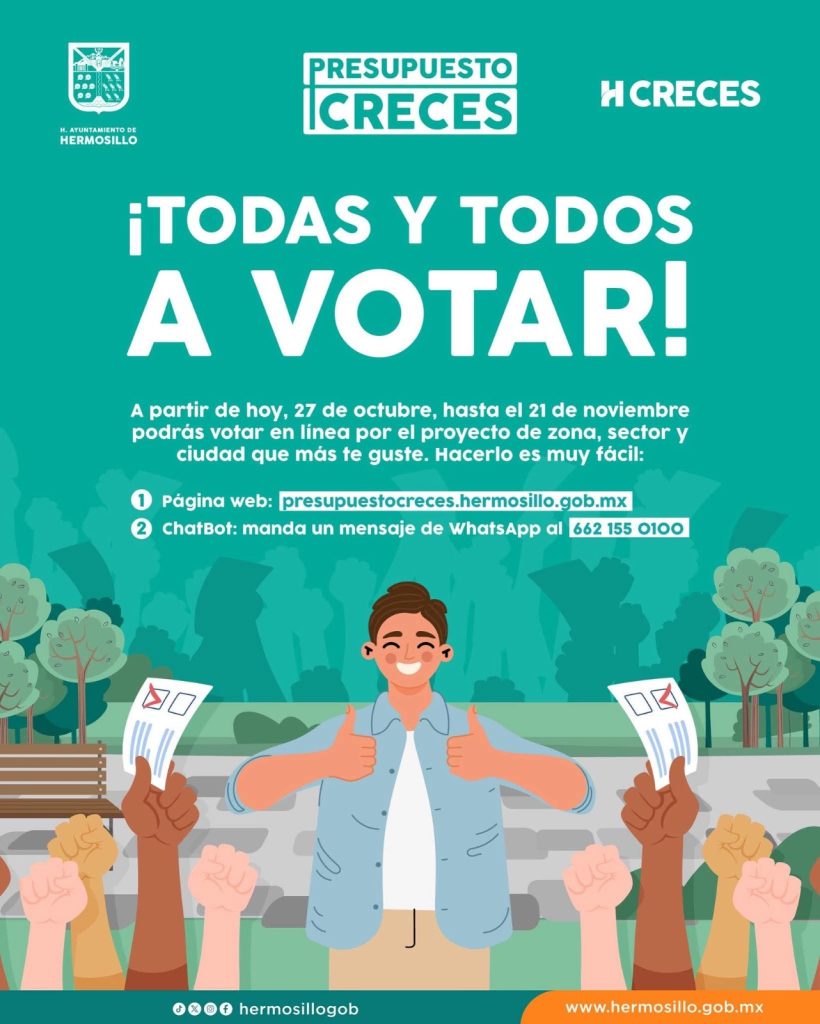 El director de Participación Ciudadana en la administración municipal que encabeza Antonio Astiazarán Gutiérrez precisó que ya están abiertas las opciones de votación en línea desde la página https://presupuestocreces.hermosillo.gob.mx/ y por medio del ChatBot “Hola”, por whatsapp, en el número 6621 55 01 00.