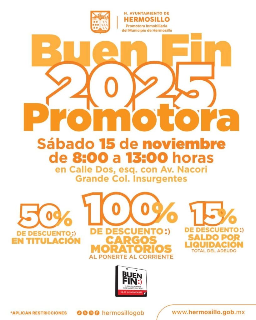Hermosillo, Sonora, 13 de noviembre de 2025.- Como parte de las promociones del Buen Fin que el Gobierno Municipal ofrece, Promotora Inmobiliaria del Municipio de Hermosillo ofrecerá atractivos descuentos este sábado 15 de noviembre de 8 de la mañana a 1 de la tarde.