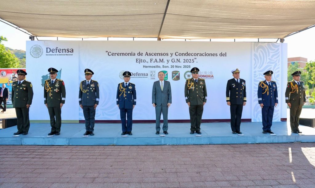 Hermosillo, Sonora, 21 de noviembre de 2025.- Un reconocimiento al profesionalismo, compromiso y entrega que demuestran las Fuerzas Armadas en su labor diaria, realizó el gobernador Alfonso Durazo Montaño al encabezar, ayer, el evento de la Ceremonia de Ascensos y Condecoraciones 2025 del Ejército, Fuerza Aérea Mexicana y Guardia Nacional, en la que 31 oficiales fueron promovidos a su grado inmediato superior.