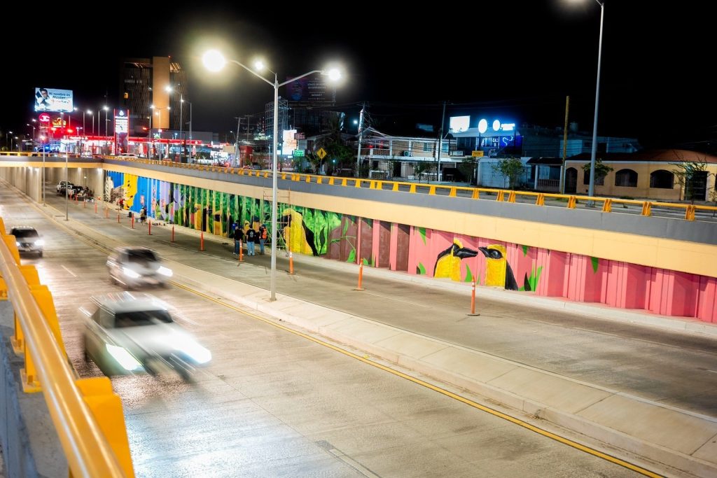 Hermosillo, Sonora, 25 de abril de 2026.- El colectivo de artistas visuales Sangre del Desierto trabajan intensamente en jornadas nocturnas, y con apoyo en seguridad vial, en la intervención artística en los muros del paso a desnivel de los bulevares Colosio y Solidaridad para convertirlo en un espacio de expresión cultural e identidad urbana.